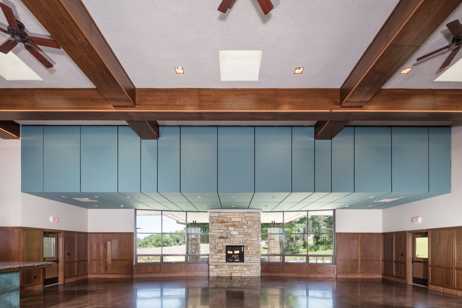 The previous lodge had large glulam beams that the owner desired to salvage and reuse. Due to the more open floor plan of the new lodge, it wasn't financially viable to reuse the glulam beams. Working with the owner, we were able to come up with a more elegant solution that incorporated recessed lighting within the beams. The primary room lights can be turned off and the beam lights can be used as accent lighting.